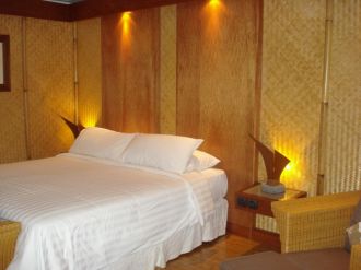 Après une traversée (18km sépare les deux îles sœurs) de 25 minutes en catamaran, nous sommes à Moorea… transfert vers l’hôtel encore plus beau que le précédent…accueilli avec collier de fleurs, coktail de jus de fruit, nous découvrons ensuite notre chambre…superbe…champagne offert aux jeunes mariés et un petit tapa en cadeau…