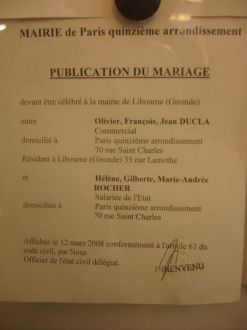 Publication des bans Là, ça devient très officiel ! Publications des bans faites à la Mairie de Libourne et Paris XVème ! voici la photo prise ce week end ! Dernière ligne droite.... Message déposé le 23.03.2008 à 10:11 - Commentaires (992)pour la petite histoire, nous avons dû domicilier Olivier à Libourne, sinon nous ne pouvions pas nous marier là-bas.... et nous marier à Amiens, ben .... on n'a voulu vous imposer ça..... La liste de mariageLes faire-part sont en cours d'expédition, et notre liste est ouverte.... Message déposé le 08.02.2008 à 17:09 - Commentaires (0)voici le lien pour y accéder (cliquez ici pour suivre le lien) Les photos ne sont pas disponibles sur le site des Galeries Lafayette, ci-joint le site de la Ménagère et du Service de table. Pour le service de table (cliquez ici pour suivre le lien) La ménagère (cliquez ici pour suivre le lien) Pour les plats (cliquez ici pour suivre le lien) Dimanche 3 Février - 1er rendez-vous individuel avec Laurent ChauvinDimanche 3 février à 9h30 nous avons eu notre premier rendez vous avec Laurent Chauvin à l'Eglise Saint-Jean-Baptiste de Grenelle. Notre entretien a duré 1h00, et nous avons eu de très bons échanges, le prochain rendez vous est fixé fin février, et cette fois, Laurent Chauvin viendra chez nous.... Message déposé le 05.02.2008 à 12:18 - Commentaires (0) Week-end des 9-10 Février2ème essayage pour la robe de mariée...... Message déposé le 05.02.2008 à 12:16 - Commentaires (0)le marié n'a toujours rien vu!!! le suspense demeure........ Week-end du 1er FévrierCa y est, nous sommes allés ouvrir notre liste de mariage aux Galeries Lafayette. Nous y sommes allés vendredi après midi, il y avait un peu de monde, mais quand nous y sommes retournés samedi ... entre les soldes, les futurs mariés.... enfin il y avait un monde fou! mais bon la liste est faite, elle sera en ligne en milieu de semaine voire fin de semaine, nous vous tiendrons au courant Message déposé le 05.02.2008 à 12:15 - Commentaires (0) Préparation à l'Eglise - suiteNotre premier rendez-vous avec Laurent Chauvin, qui est diacre à la paroisse Saint-Jean-Baptiste de Grenelle aura lieu le 3 février à 9h30. Message déposé le 22.01.2008 à 12:07 - Commentaires (0) Week-end bricolageAlors, ce week end, nous avons fabriqué nos faire-part, il ne nous manque plus que quelques adresses, et vous ne devriez pas tarder à les recevoir... alors, soyez attentifs ... Message déposé le 22.01.2008 à 12:05 - Commentaires (0) Préparation au Mariage, Paroisse St Jean Baptiste de GrenelleNous venons de passer un super Week end en compagnie d'une quinzaine d'autres couples qui se marient également dans l'année. Message déposé le 13.01.2008 à 21:34 - Commentaires (0)Un peu méfiant au début, nous avons été supris de la qualité de cette session de préparation au Mariage, qui consistait à réflechir sur l'engagement que nous allons prendre. Très bon accueil, 2 couples animateurs, accompagnés de 3 prêtres. Au menu, scéances de réflexion sur le Mariage et la vie de couple: de nombreux échanges avec d'autres futurs mariés. Ambiance très détendue, pauses (clopes), apéritifs et diner. Un très bon moment partagé avec nos voisins de quartier dont nous attendons des nouvelles (Sophie et Yann, Caroline et Thomas, Elsa et Cyrille !!!) Les fiançaillesMessage déposé le 06.01.2008 à 16:10 - Commentaires (0) LES PARENTS DES MARIÉSCette photo a été prise à Marsais sainte Radégonde, c'était la première rencontre entre nos deux familles - le 1er novembre 2006. Un week end un peu stressant, mais qui finalement s'est très bien passé.... ouf! Message déposé le 06.01.2008 à 16:07 - Commentaires (0) Notre rencontreNous nous sommes rencontrés le 22 juillet 2005 au restaurant le 7ème vin, dans le 7ème arrondissement, comme son nom l'indique, puis nous nous sommes perdus de vue (enfin presque) pendant deux mois, et le 2 octobre, nous nous sommes retrouvés, pour ne plus nous quitter. Message déposé le 06.01.2008 à 15:49 - Commentaires (0) Le MariéJe suis né à Libourne le 1er février 1975, et je suis l'ainé de 3 petites soeurs ! Elève assidu et brillant (ancien Bac D), je m'égare quelques années en fac LEA à Bordeaux 3. Apres quelques années d'etudes, à Bordeaux (BTS), Poitiers, Toronto et Montréal (ESC), je débarque à la Capitale chez Valeo où je travaille actuellement. Message déposé le 06.01.2008 à 15:40 - Commentaires (0)J'adore ma famille, le vin, les voyages et les Girondins de Bordeaux. Par dessus tout, j'aime... HELENE ! La MariéeJe suis née le 3 février 1974 à Fontenay le Comte (Vendéenne de souche et de coeur). J'ai grandit à Marsais Sainte Radégonde, charmant petit village du Sud Vendée (300 habitants). J'ai passé mon temps entre l'Ecole de musique et les piscines olympiques, dans l'espoir de devenir Laure Manaudou, hélas, je n'avais pas d'entraîneur comme Philippe Lucas. Finalement je suis aujourd'hui assistante au Cabinet du Ministre de l'Intérieur (oui je sais ca peut faire sourire, mais ça s'appelle comme ça!!!.....)Sinon quoi dire d'autre... que je supporte le Football Club de Nantes Atlantique (FCNA) depuis toujours. Message déposé le 06.01.2008 à 15:38 - Commentaires (0) L'HEBERGEMENTPetite sélection d'hébergement pour que nos hôtes soient frais et dispos tout le week end! Message déposé le 04.01.2008 à 10:51 - Commentaires (0)Hôtel de France de 55 à 145 € + 7 € Pdéj (cliquez ici pour suivre le lien) Kyriad - Arveyres 68 € + 8 € Pdéj (cliquez ici pour suivre le lien) Mercure - Libourne de 98 à 108 € + 12 € Pdéj (cliquez ici pour suivre le lien) INFOS PRATIQUES - LE TRANSPORTComment venir à Libourne Message déposé le 04.01.2008 à 10:46 - Commentaires (1)Par le train, ben là c'est simple, pour les parisiens, départ de gare Montparnasse, puis 3h15 plus tard, arrivée à Libourne, gare située en centre ville -hôtel de France à 