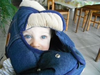 15 mois !Nathan est un petit farceur ! Ce matin, il a trouvé le porte bébé dans l'armoire de sa chambre. Aprés avoir joué avec les fermetures, puis l'avoir trainé dans toute la maison, il s'est dis qu'avec la neige dehors, il avait besoin d'une chapka... Il s'en est donc fait une avec le porte-bébé ! ! !