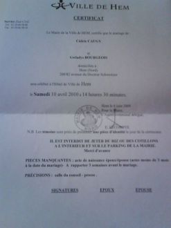 Notre Histoire2 ans déjà... La demande en mariage!!! Un homme - une femme : Cha bada bada, cha bada bada... Les PrésentationsLa petite dernière de la fratrie Caugy : Marie, ma « jumelle » … Le cousin de l'Héroïne : Reynald, son second témoin Le frangin du Héros : Matthieu, son second témoin La grande sœur du Héros : Stéphanie, son premier témoin La grande soeur de coeur de l'Héroïne : Audrey, son premier témoin Distribution des rôles pour le Jour J... Portrait chinois du marié (selon elle / selon lui) Portrait chinois de la mariée (selon lui / selon elle) Les PréparatifsJ - 3 : Tout est prêt pour samedi ! J - 4 : Où en sommes nous ? J - 10 : Avancée des travaux J - 11 : Notre livret de messe est enfin prêt ! J - 12 : Présentation des tables, suite et fin (presque !) J - 14 : Rendez-vous Lucaty J - 16 : Composition du plan de table, suite et fin J - 17 : Le plan de table J - 19 : Le livret de messe, suite J - 20 : Avancée du livret de messe J - 21 : les pronostics des filles ! J - 22 : on en est où ? J - 23 : Marque-places et fleuriste J - 25, programme du jour J - 27 : Un week end sans aucun préparatifs ! J - 30 : Les boites à dragées, le retour !!! Ni riz, ni pétales de roses… J - 32 : Rencontre avec le diacre Bernard Bigotte J - 33 J - 34 : Programme du jour J - 35 : les dernières nouvelles du front Vient ?? Vient pas ?? Après les essais robes, les essais coiffure !!!! Et on change une 3ème fois de prêtre !!! Un des temps fort de la cérémonie religieuse : la musique Livraison expresse des alliances !!! Les faire-parts : Distribution terminée Les séances de préparation au mariage : 1er et 8 décembre 2009 27 - 28 - 29 Novembre 2009 : Salon du Mariage de Lille Fabrication des faire parts : c'est parti !!!! MON costume de marié !!!! La rencontre avec le prêtre : que de rebondissements !!!!! MA robe de mariée !!!!! 1ères ébauches du faire-part... 1ère rencontre avec notre DJ Notre photograhe Nouvelle étape : le dossier, c'est fait... Les 1ers essayages : enfin !!!!!!!! Robe de mariée : 1ère boutique en vue !!!! La musique... 23 janvier 2009 : Le secret des blés à Ronchin 20 janvier 2009 : Le Lucaty à Mouscron (Belgique) 17 janvier 2009 : La Ferme du Moulin à Villeneuve d’Ascq 17 janvier 2009 : L’Auberge du Tilleul à Hem 16 janvier 2009 : Les Charmettes à Mouscron (Belgique) 7 janvier 2009 : Les Pyramides à Lys lez Lannoy A la recherche de notre salle : c'est parti mon kiki ! Liste de MariageVous avez déposé une liste quelque part ? Le jour J10 avril 2010 : Que de surprises, que d’émotions… Toi quand tu m’serres très fort, c’est comme un trésor, et ça, ça vaut de l’or… 10 avril 2010 : la soirée 10 avril 2010 : Le vin d’honneur 10 avril 2010 : nos alliances 10 avril 2010, 16h00 : Cérémonie religieuse 10 avril 2010 : Séance photos 10 avril 2010, 14h30 : La mairie 10 avril 2010 : on se prépare ! Le Jour J : 10 avril 2010 INFOS PRATIQUES POUR LE JOUR J – RESERVATION DES HOTELS DiversMon EVJF le vendredi 2 avril 2010 J - 13 : Présentation des noms de table Mon dernier anniversaire en tant que « célibataire vingtenaire » : mes 29 ans !!! J-100 !!!!!! C’est cool Noël entre frangins !!!! Une grande tradition fin octobre : Halloween… 10 – 17 Octobre 2009 : Nos vacances sur l’île de Kos (Grèce) Les 4 ans de Lou De retour après 2 semaines d’absence… Fete surprise : les 50 ans de mariage de Ginou et Lucien 13 juin 2009 : Mariage de Rébecca et Mickael Message personnel... En l'honneur de la future mariée... Week end du 8 mai Vacances à Toulouse Joyeuses Paques !!! La bourse aux livres (d'occasion) de Lille J- 1 an !!! Toutes nos félicitations !!!! Une journée toute particulière... Bienvenue à toutes et à tous... |