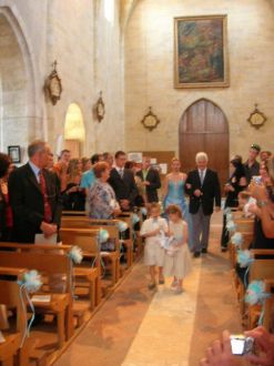 A l'église 02Et voilà que j'avance dans l'allée de l'église, au bras de mon papa.. précédés de nos deux enfants d'honneur, Méline et Gauthier, qui s'en sont plutôt bien sortis entre les pétales, les alliances, et les bulles de savon !!!  Message déposé le 09.09.2007 à 18:36 - Commentaires (0)