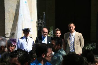 Sortie de la mairieNous voilà mari et femme au yeux de l'état. On va se lancer dans une petite séance bisous à tout le monde, avant de rejoindre l'église. Comme vous pouvez le constater, j'ai enfin mon bouquet de fleur à la main : un grand merci à Nanou qui est allée le chercher chez moi pendant le mairie, puisque je l'avais malencontreusement... oublié !  Message déposé le 09.09.2007 à 18:26 - Commentaires (0)