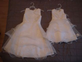 Nous avons changé d'avis pour la robe de cortège, car au premier essayage de Louise, il s'est avéré que la robe que nous avions acheté chez Point Mariage à Toulouse lui allait un peu serré d'en haut, et ce, au moins de mars, donc qu'est ce que ça aurait été au mois de juillet... Au pire ma mère aurait fait des retouches, mais pour ne pas lui donner de travail en plus, j'ai préféré en racheter une autre. Je suis tombé dessus par hasard chez Tati, et comme le prix n'était pas excessif, j'en ai pris une aussi pour Hailie, l'autre petite cousine de Julien, qui va faire 2 ans le 7 juillet. Elles vont être mimi toutes les deux!!!!