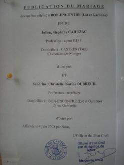 Ce matin, je suis allée photographier les bans qui ont été affichés à Castres. Comme ceux de Bon-Encontre, ils n'ont pas de date car une dame de la mairie a expliqué à ma mère qu'ils ne mettaient plus de date à cause des éventuels reports de mariage. Alors... s'il le disent!