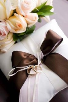 Les alliances sont posées sur le coussin, piquées ou nouées par un ruban. Une signification sacrée et magique. Le nœud évoque une croyance de lutter contre la mort.