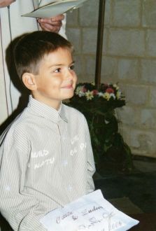 Je vous passe la sortie de mairie, que j'ai déja mis plus bas...Passons à l'église...Voici Léo qui a porté le coussin d'alliance en remplacement de Théau qui n'a pas voulu car il faisait sa crise d'adolescence en avance (à 8 ans, et oui...), mais bon à l'église, ils étaient sages alors ne disons rien...Ensuite, l'entrée (sans tomber), la célébration, les signatures, l'offrande et voila, ca passe vite tout compte fait une heure...  Message déposé le 25.10.2006 à 18:41 - Commentaires (0)