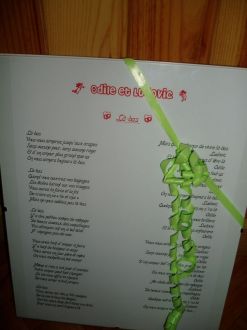 Surprise en chansonAlors là, fallait bien pleurer un coup, vu que je m'étais retenue toute la journée, arrivé en fin de soirée, ca devient dur de se tenir alors bingo...Les amis (séverine, esther, valou, fred, gerald et laurent) nous ont écrit et chanté une chanson, sur un air de Jean jacques goldman en plus...MERCI A EUX...  Message déposé le 29.10.2006 à 10:57 - Commentaires (0)